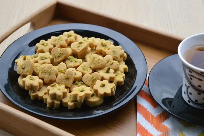 کف سینی فر را با کاغذ روغنی بپوشانید و شیرینیهای قالبزده را داخل آن بگذارید. سینی فر را در طبقه وسط فر قرار دهید و 15 دقیقه زمان بدهید تا شیرینیها آماده شوند. پس از آماده شدن شیرینیها، آنها را از فر خارج کرده و اجازه بدهید در دمای اتاق سرد شوند. حالا میتوانید با مقداری خلال یا پودر پسته روی شیرینیهای نخودچی را تزئین کنید.